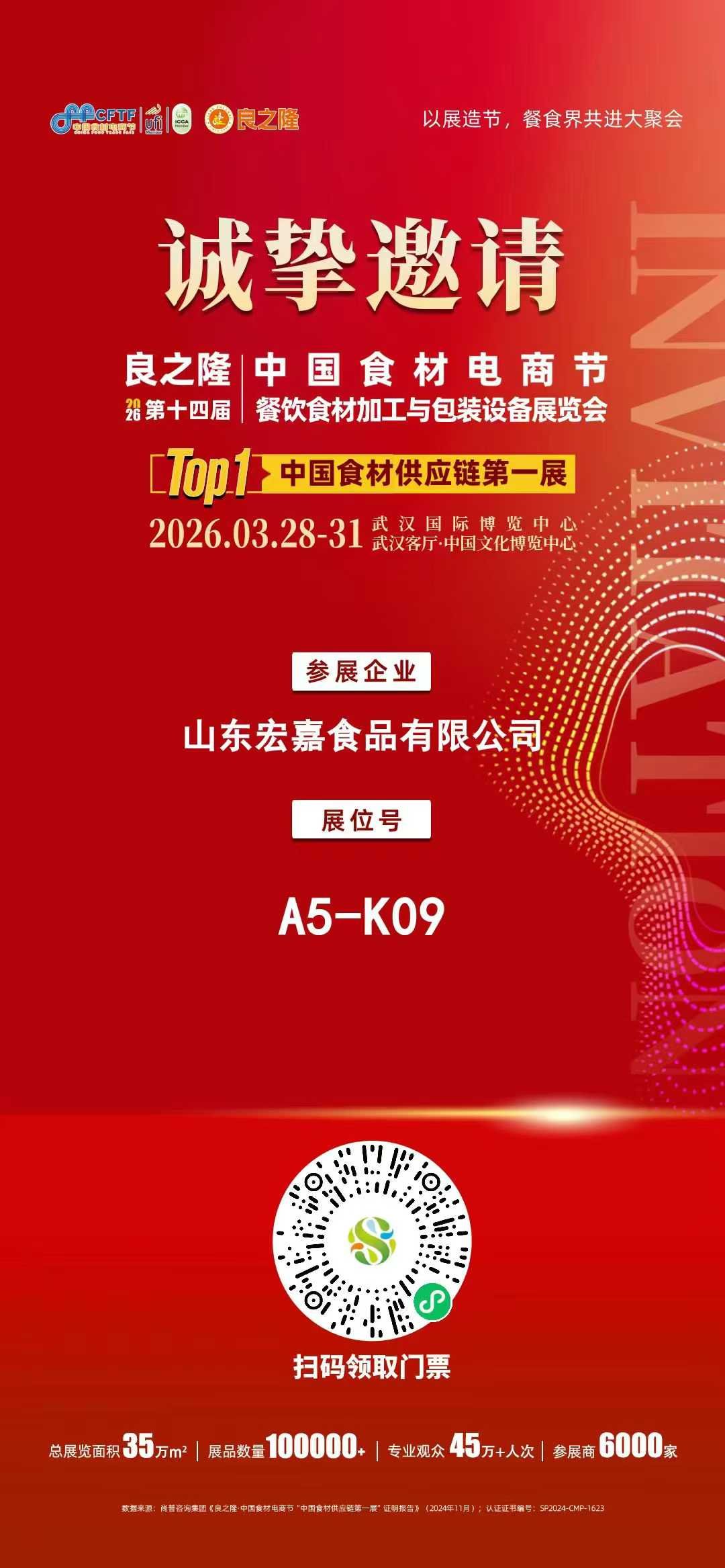 宏嘉食品正式官宣:3 月 28-31 日,咱们要亮相武汉国际博览中心的第 14 届中国食材电商节(良之隆食材节)!这可是经 UFI 认证的 “中国食材供应链第一展”,规模超大,绝对是对接全球买家、拓展餐饮合作的好机会~
