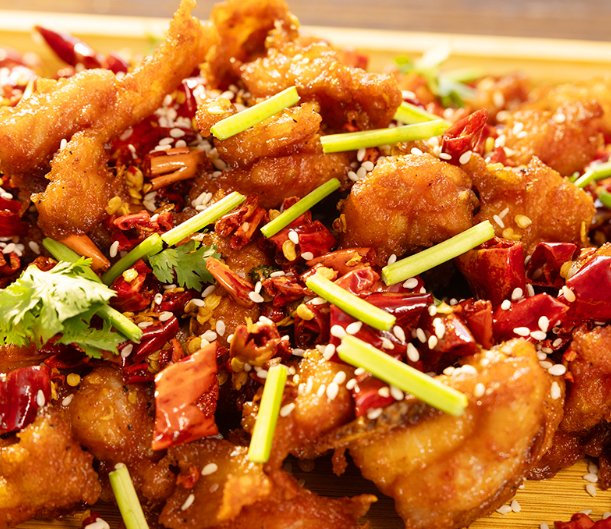 2)锅里放油,油热后加入解冻后的产品油炸3-5分钟至熟,出锅装盘即可食用。也可根据个人喜好加入辣椒、花椒等配菜一同翻炒。