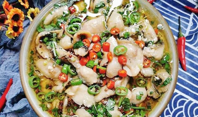 5、 将腌制好的鱼片一片一片依次放入汤中,用筷子缓缓搅开,鱼片煮至浮起后关火,连汤带鱼片倒入碗内,将剩余的青红椒花椒+香菜+葱花放在鱼片上;
